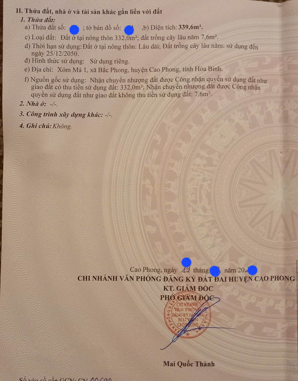 - Diện tích: 339,6 m²♦ Trong đó:332 m² đất ở nông thôn (xây dựng thoải mái, sử dụng lâu dài)7,6 m² đất trồng cây lâu năm