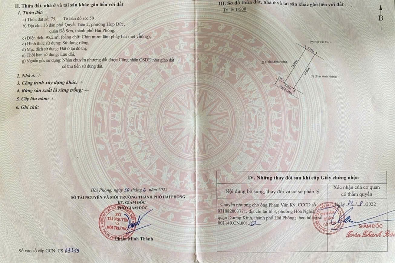 -Diện tích: 95,2m²-Mặt tiền: 5m-Hình thức sử dụng: Sử dụng riêng-Pháp lý: Sổ đỏ chính chủ, sang tên ngay-Đường trước đất: Ngõ nhựa sạch đẹp, ô tô nhỏ vào tận nơi-Vị trí: Quyết Tiến 2, Hợp Đức, Đồ Sơn, Hải Phòng-Khoảng cách: Cách trục chính đường Quyết Tiến hơn 100m, gần chợ Quyết Tiến-Khu dân cư: Đông đúc, xung quanh nhà ở hiện hữu, điện nước đầy đủ