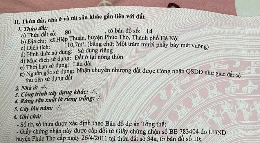 - Vị trí đất : Xã Hiệp Thuận - Huyện Phúc Thọ - Hà Nội