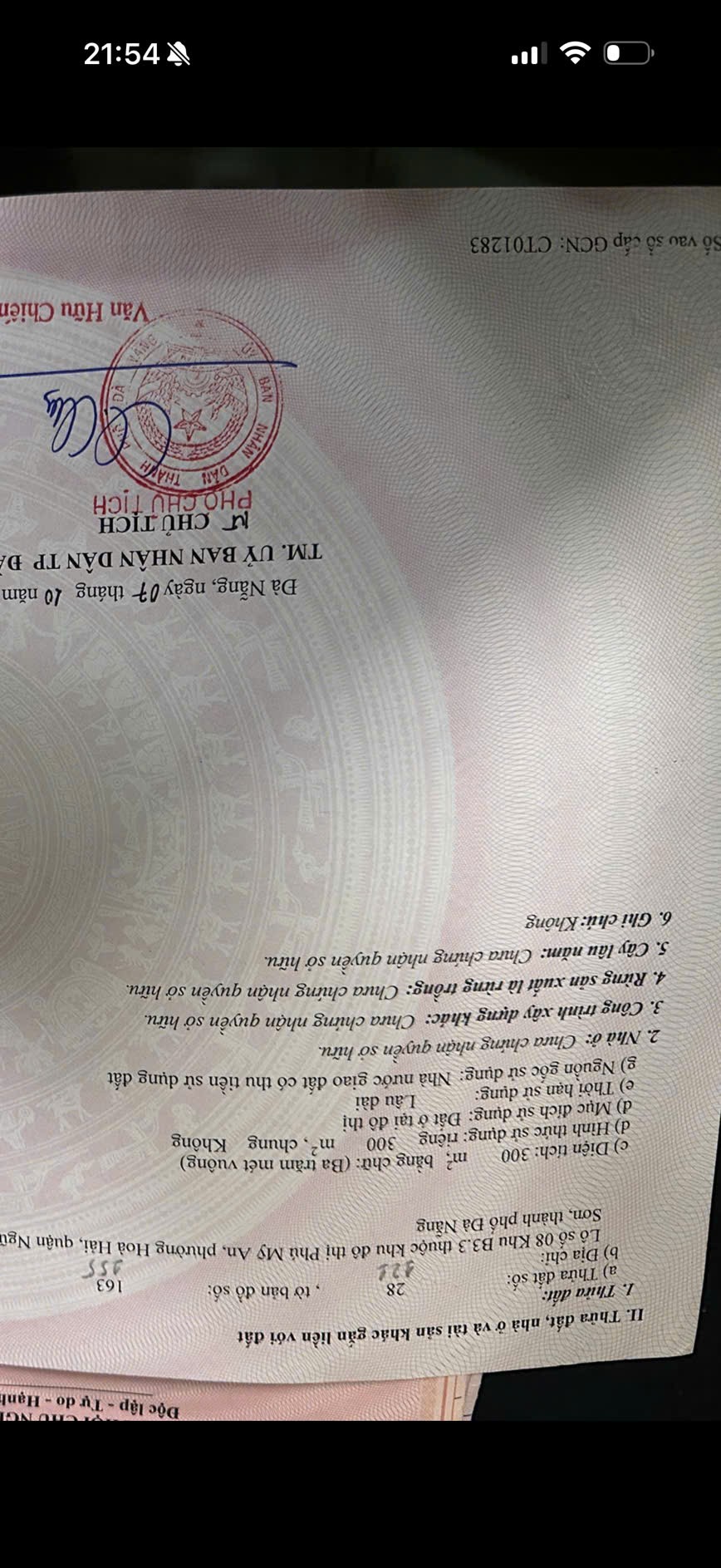 Diện tích: 300 m2 ( trong sổ )