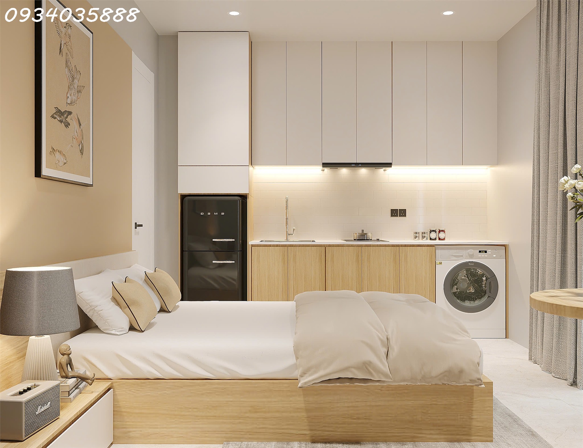 Nội thất có sẵn gồm giường ngủ, tủ quần áo rộng, điều hòa, nóng lạnh, bếp từ đôi nấu ăn, máy giặt riêng từng phòng, tủ lạnh 130L, bàn ghế đầy đủ. Mỗi phòng đều có không gian bếp riêng, phù hợp sinh viên và người đi làm.