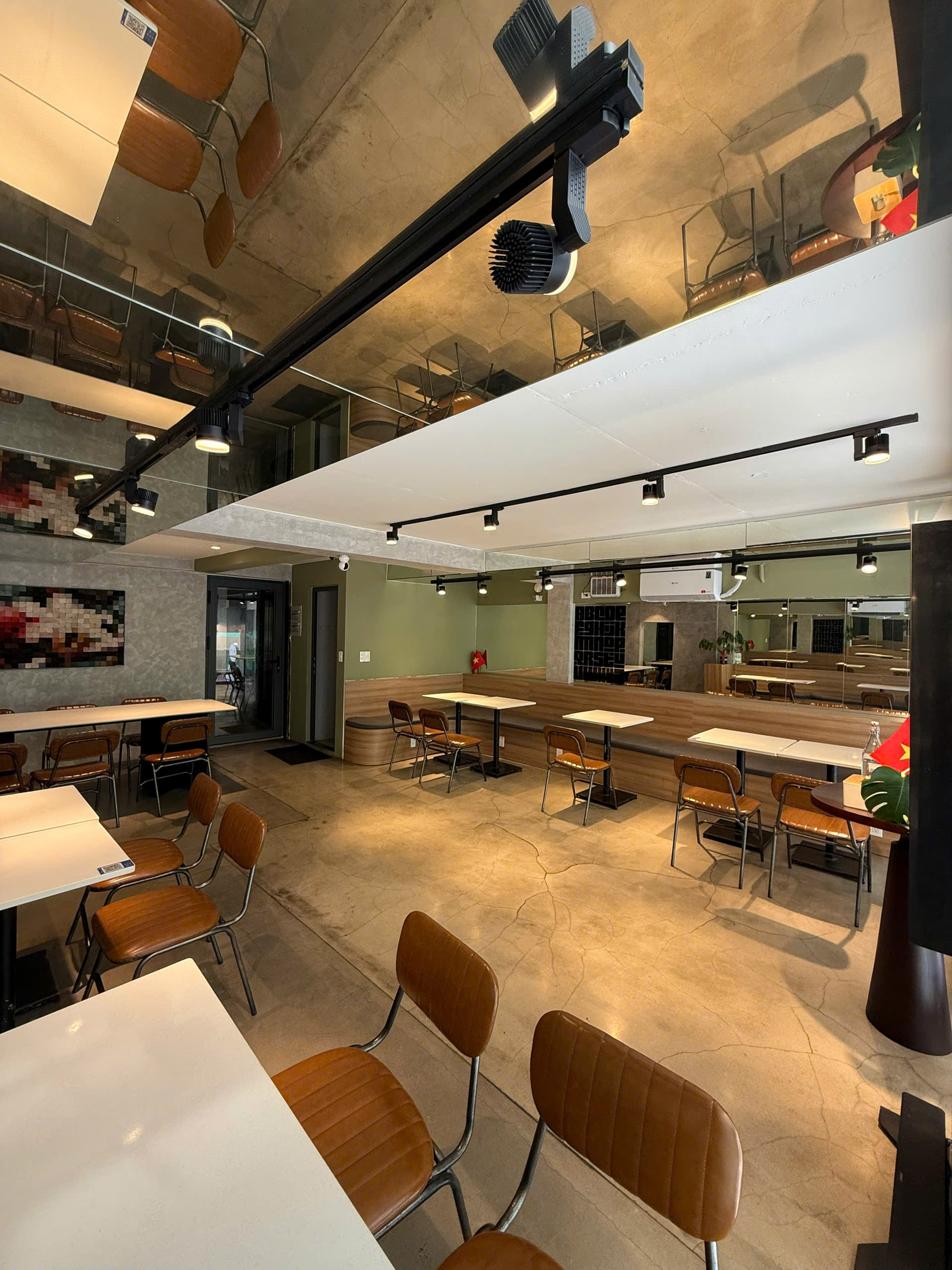 + Tầng trệt mặt tiền kinh doanh: 50m2. Sẵn bàn ghế quầy kệ phù hợp làm quán café, tiệm bánh hoặc showroom, kinh doanh. Giá 14,000,000/tháng + phí quản lý.