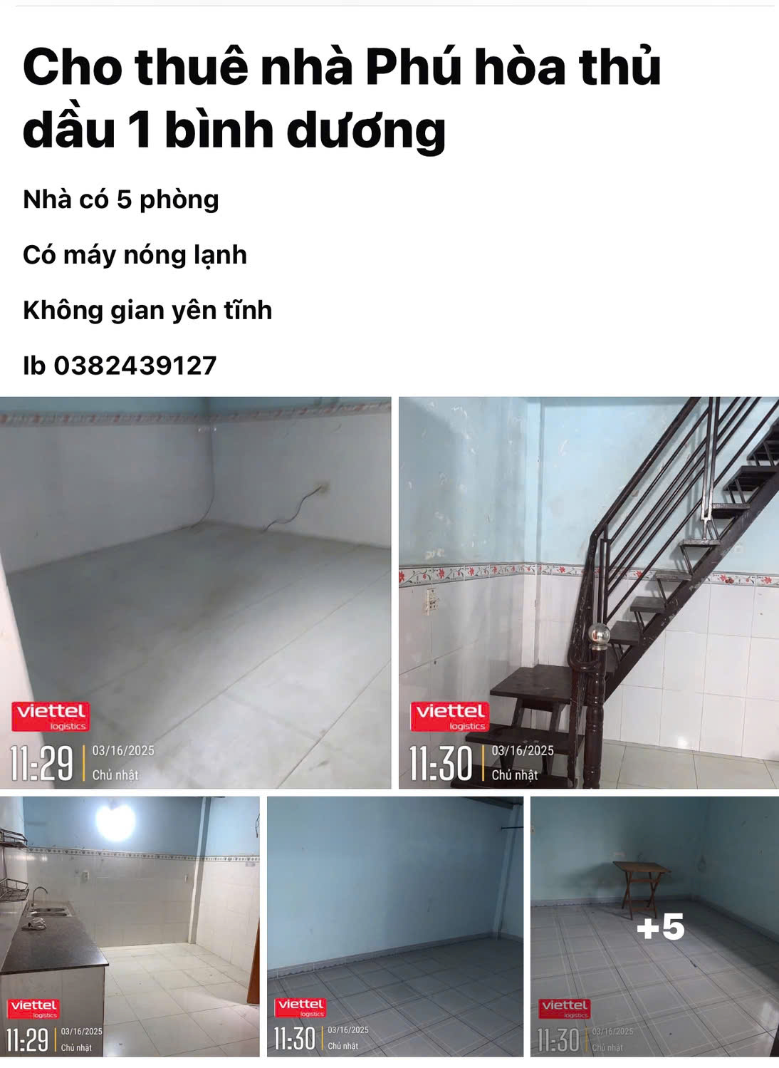 ► CHO THUÊ NHÀ NGUYÊN CĂN – PHÚ HÒA – THỦ DẦU MỘT – BÌNH DƯƠNG♦ Nhà rộng, nhiều phòng – phù hợp gia đình hoặc nhóm ở♦ Khu Phú Hòa, TP. Thủ Dầu Một, Bình Dương♦ Khu vực yên tĩnh, an ninh tốt♦ Diện tích: 75m² (tổng sử dụng 105m²)♦ Gồm 5 phòng♦ Giá thuê: 5 triệu/tháng♦ Hợp đồng: từ 1 năm trở lên♦ Tiện ích: ✅ Có máy nước nóng lạnh✅ Không gian thoáng, yên tĩnh✅ Phù hợp gia đình, nhóm người đi làm► Liên hệ: 0382439127