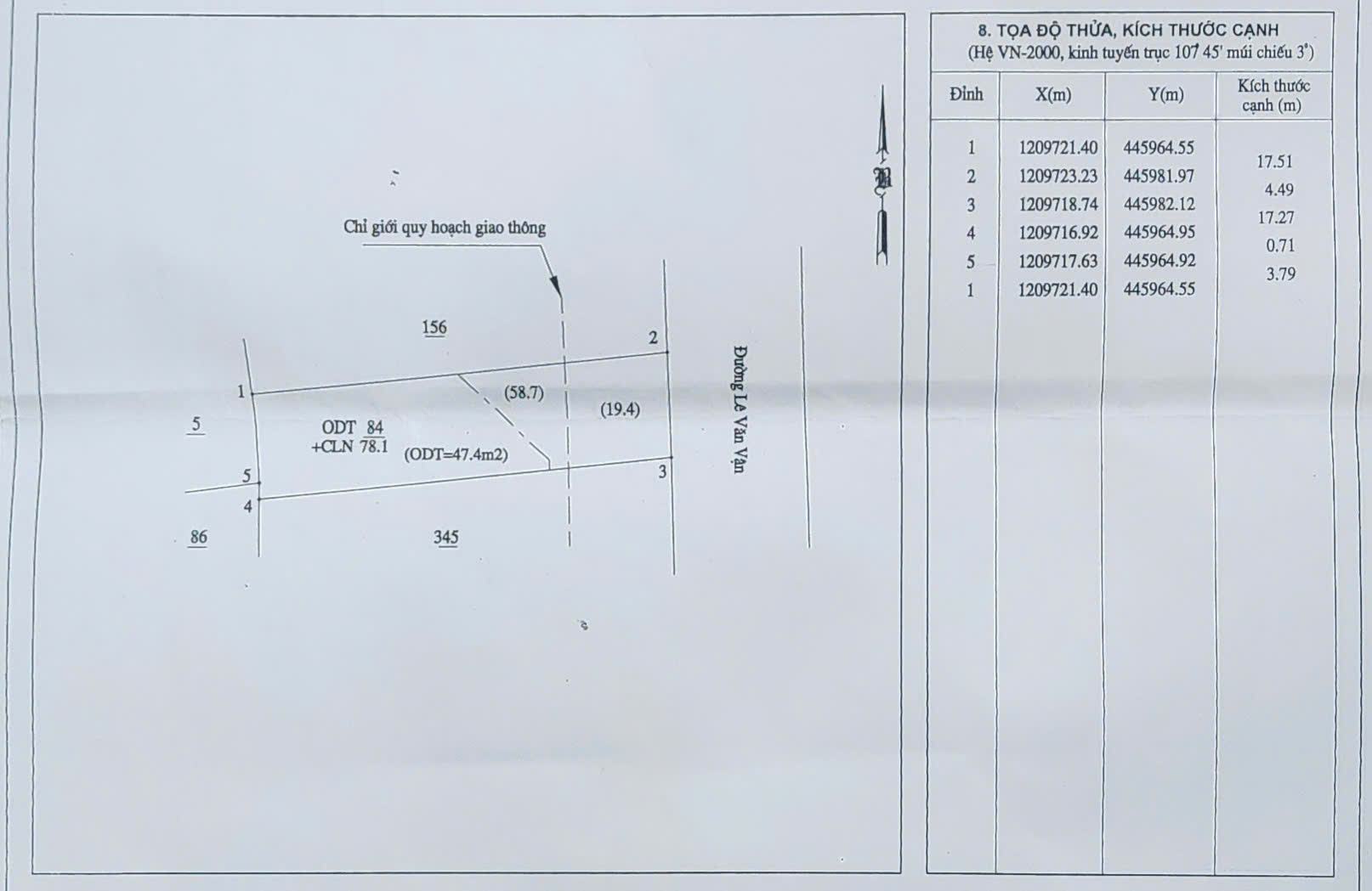 ** Diện tích: 78,1m2 Đất thổ cư ODT: 58,7 m2 (đã trừ lộ giới) Đất CLN: 19,4 m2