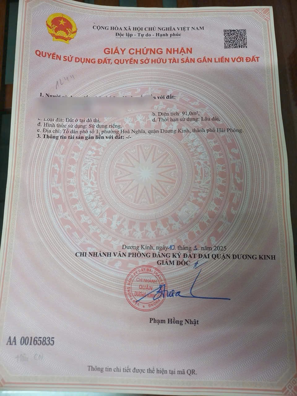 -Diện tích: 91m² (ngang 4,59m – nở hậu 5,39m, cực đẹp)-Đường nhựa rộng, ô tô tránh thoải mái-Vị trí: mặt đường Hòa Nghĩa – cách ngã 4 Hải Phong và ngã 4 phố Sông He chỉ vài chục mét-Gần chợ Hải Phong, khu dân cư đông đúc, kinh doanh cực tốt-Cách dự án Vin Dương Kinh chỉ ít phút di chuyển – khu vực đang phát triển mạnh-Pháp lý: Sổ đỏ chính chủ, sang tên ngay-Giá bán: chỉ 3,4x tỷ – hàng hiếm mặt đường trung tâm Hòa Nghĩa-Tiềm năng: hạ tầng mở rộng – khu thương mại sôi động – thanh khoản cao