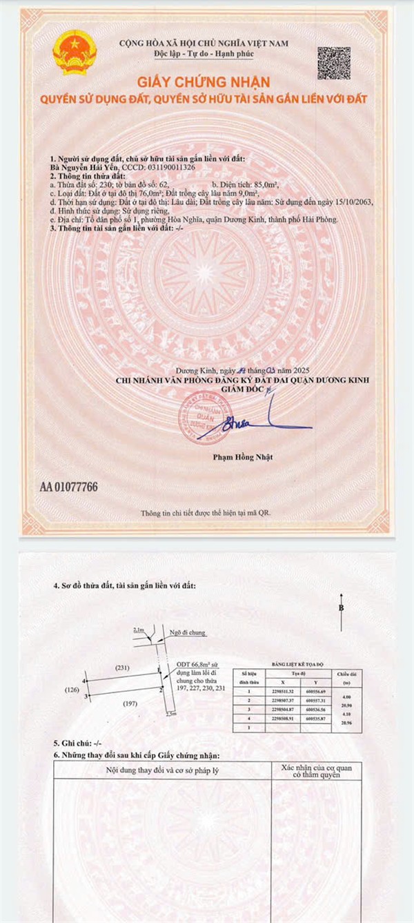 -Diện tích: 85m²-Mặt tiền: 4m-Đường trước đất: Ngõ ô tô, kết nối nhanh ra trục chính-Vị trí: Tổ 2 Hòa Nghĩa, quận Dương Kinh, Hải Phòng-Kết nối: Cách trục đường Hòa Nghĩa khoảng 50m-Khu vực: Dân cư đông đúc, nhà xây kín, hạ tầng ổn định-Liên kết vùng: Gần khu Vinhomes, di chuyển thuận về cầu Rào 3 và trung tâm-Pháp lý: Bìa hồng chính chủ, sẵn sàng giao dịch