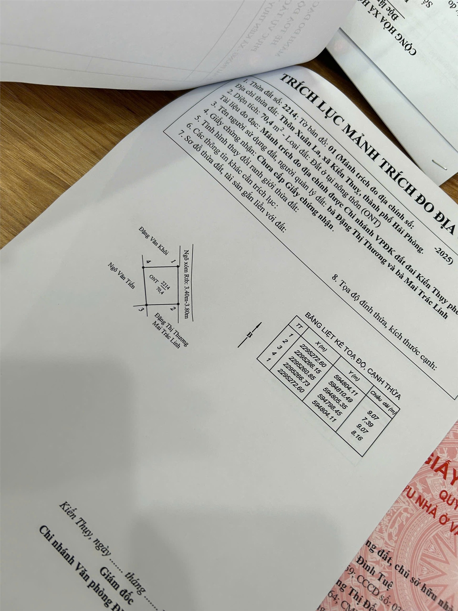 -Diện tích: 63.8m² và 70.4m² (2 lô liền kề)-Mặt tiền rộng, đất vuông vức, không lỗi phong thuỷ-Đường trước đất ~4m, ngõ thông, ô tô vào thoải mái-Vị trí: Trung tâm thôn Xuân La, Thanh Sơn, Kiến Thuỵ – đối diện khu đấu giá-Tiện ích: Gần trường học, sân thể thao, chợ – mật độ dân cư cao-Pháp lý: Sổ đỏ sạch, sẵn sàng giao dịch-Giá: 63.8m² giá 1 tỷ 2xx 70.4m² giá 1 tỷ 3xx-Tiềm năng: Khu trung tâm phát triển mạnh, giá đất tăng theo trục Thanh Sơn – Kiến Thuỵ, thanh khoản nhanh