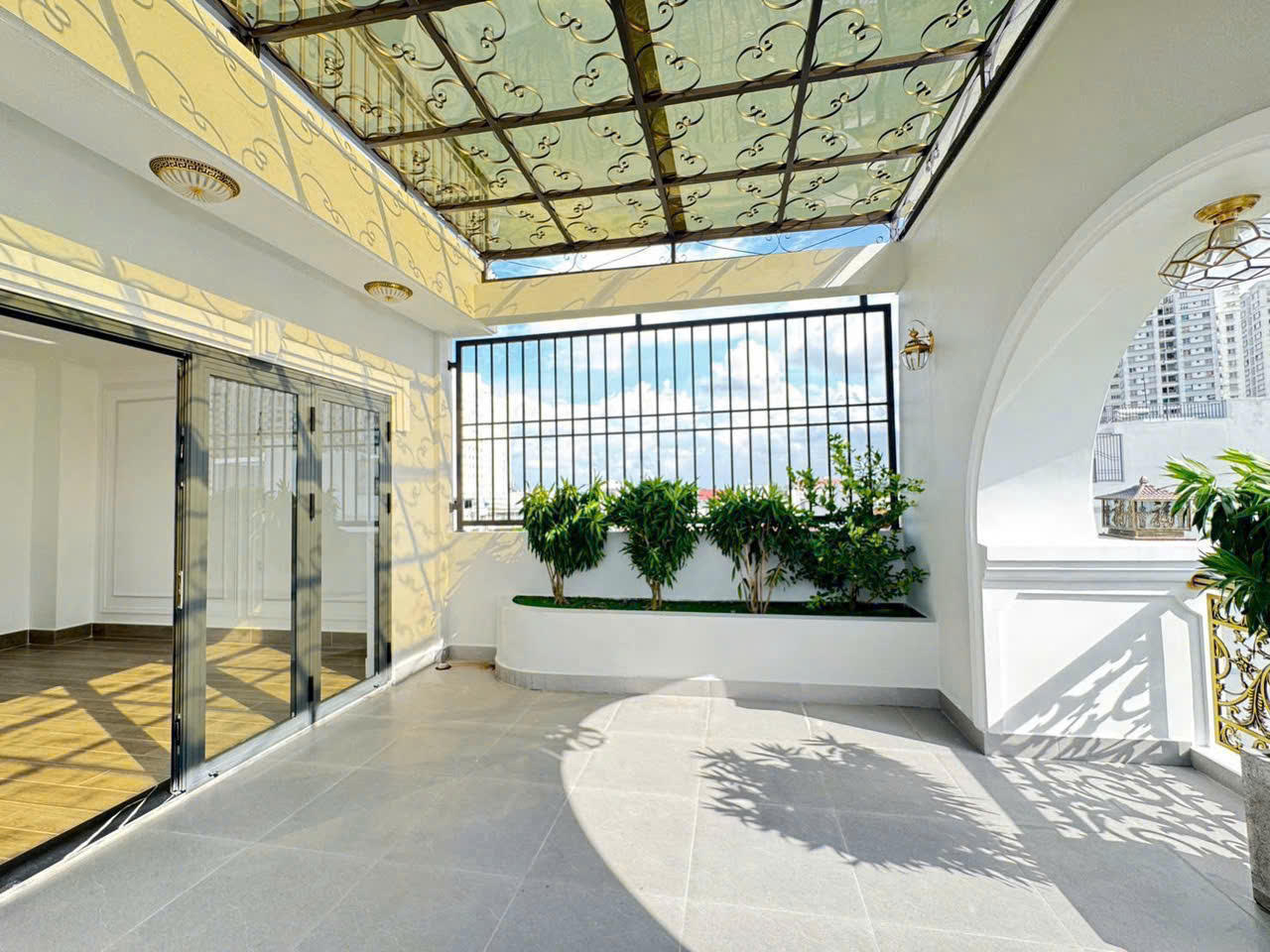Kết cấu: 1 trệt, 2 lầu, sân thượng; gồm 4 phòng ngủ, 5 WC, phòng thờ và gara ô tô.