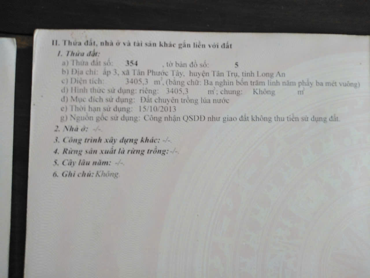 * Đất nằm ở vị trí thuận lợi cho trồng trọt và tưới tiêu nhờ tiếp giáp sông, nguồn nước ổn định. Trong đó có 1 miếng diện tích 970m², đất trồng cây lâu năm.
