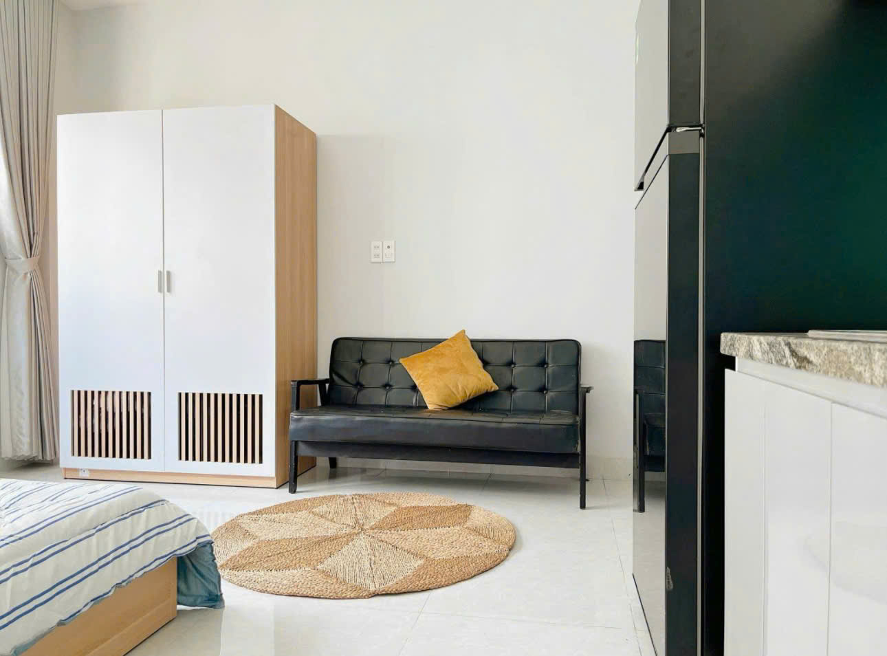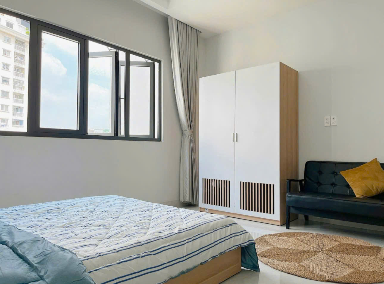 – Giá thuê: 5.5 triệu/tháng– Ra vào bằng khoá vân tay, không chung chủ, tự do 24/7– Có thang máy, khu vực để xe riêng– Full nội thất như hình– Khu giặt – sấy tiện lợi– Điện: 4.000đ/kWh– Nước: 100.000đ/người– Phí dịch vụ: 200.000đ (Wifi, rác, dọn dẹp khu vực chung, máy giặt – sấy)– Miễn phí giữ xe máy