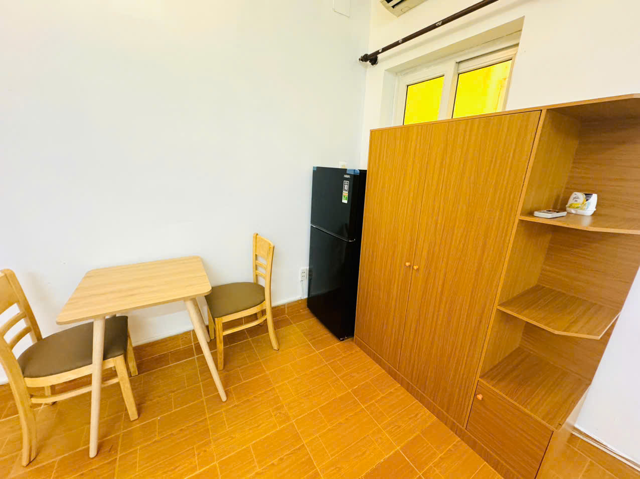 + Phòng có ban công thoáng, sạch, nội thất mới 100% sẵn: Giường gỗ +nệm, tủ quần áo, máy lạnh, tủ lạnh, bàn ăn+ghé, bếp