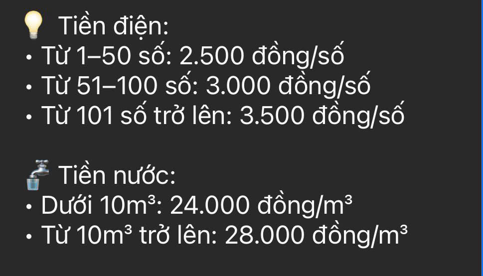 + Điện: 2.500–3.500 đ/số tùy mức tiêu thụ