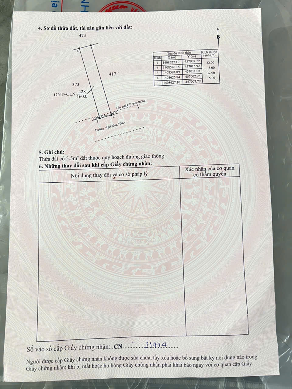 Diện tích: 160m2 ( 5x32)60m thổ cư