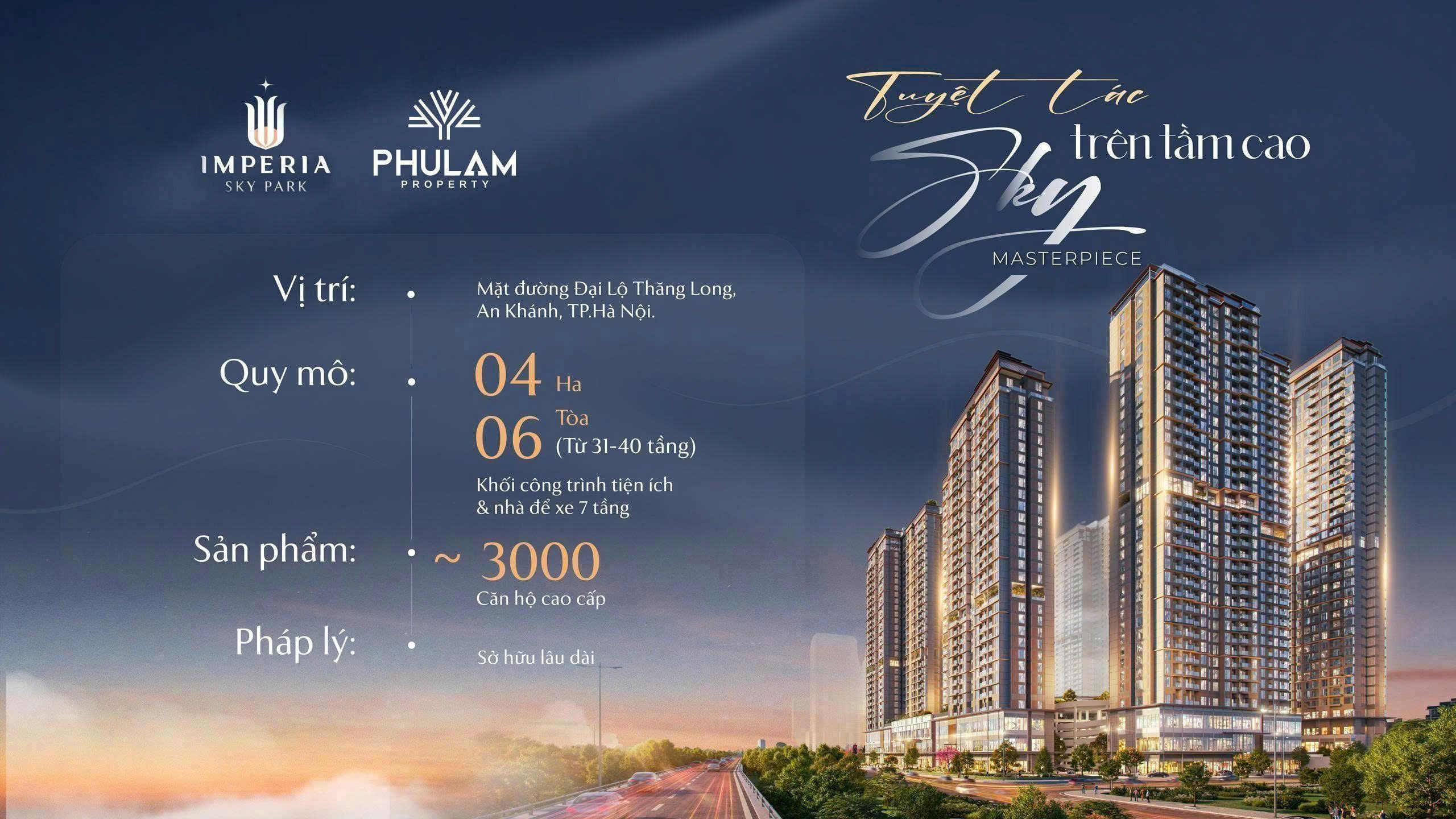 Chính thức mở bán căn hộ cao cấp MIK An Khánh Imperia Sky Park - CĐT MIK Group.Tọa lạc mặt Đại lộ Thăng Long, kề cận nút giao Vành Đai 3.5, sát cạnh đại đô thị Vinhomes Smart City vị trí chiến lược hiếm có phía Tây Hà Nội.Quy mô: Gần 4ha quỹ đất vàng còn lại tại Nam An Khánh.Phát triển: 6 tòa căn hộ cao cấp, cao 3140 tầng.Bãi đỗ xe riêng biệt: Tòa nhà để xe 7 tầng hiện đại, tối ưu vận hành & tiện ích nội khu.Miến phí dịch vụ: 2 nămPháp lý: Sở hữu lâu dài nền tảng tích sản bền vững, an tâm đầu tư.Cơ cấu sản phẩm đa dạng tối ưu dòng tiền:Studio: Diện tích từ 27 - 28m² thông thủy - Vốn tự có chỉ từ 700 tr.1PN +: Diện tích 43 m² thông thủy - Vốn tự có chỉ từ 1,1 tỷ.2PN: Đa dạng diện tích từ 53 - 68m² thông thủy - Vốn tự có chỉ từ 1,5-1,8 tỷ.:Nhu cầu cao, dễ khai thác cho thuê, thanh khoản tốt.2PN +: Diện tích từ 65 - 69 m² thông thủy - Vốn ban tự có chỉ từ 1,7-1,9 tỷ.Lý tưởng cho gia đình ở thực & tích lũy dài hạn.Dòng căn diện tích lớn Duplex và Sky Villas: Diện tích từ 98 - 167 m² thông thủy - Vốn ban tự có chỉ từ 2,6 tỷ.Siêu phẩm giới hạn, khẳng định đẳng cấp, biên độ tăng giá vượt trội.Tiện ích dự án: - FULL hệ tiện ích: Bể bơi 1000 m², TTTM, sân Pickle ball, khu vui chơi trẻ em, phòng GYM, phòng Yoga, Thư viện, phòng tiếp khách dành riêng cho cư dân, phòng game...Hạ tầng đồng bộ đòn bẩy tăng giá rõ ràng 12 năm tới.Dự án nằm trong quần thể Vista Nam An Khánh, trực tiếp hưởng lợi từ:Trục động lực Đại Lộ Thăng Long.Tuyến Vành đai 3.5 đang hoàn thiện.Hanoi Metro Line 5 đã khởi công.Hạ tầng hoàn chỉnh tạo dư địa tăng giá bền vững, đồng thời gia tăng tiềm năng khai thác cho thuê.Booking sớm nắm giữ lợi thế tiên phong:Ưu tiên lựa chọn căn đẹp tầng đẹp view đẹp.Được Chiết khấu tặng riêng cho khách hàng booking.Giữ chỗ sớm nhận bảng giá tốt nhất ngay từ đầu.Imperia Sky Park không chỉ là chốn an cư lý tưởng, mà còn là tâm điểm sinh lời dành cho nhà đầu tư nhạy bén.